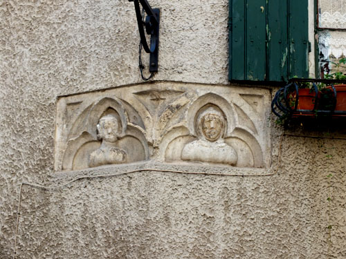 Rue du Théron, on trouve aussi à hauteur de l'étage et visible de tous car donnant sur l'extérieur, un bas relief fixé sur une façade. Joseph Guinier nous dit que ce type de décoration existait aussi à l'intérieur du bâtiment et sur le site même du Groseau. L'emprise du Prieuré se poursuivait évidemment jusqu'à cette rue et des restes d'un escalier à vis existent aussi dans un bâtiment actuellement restauré.