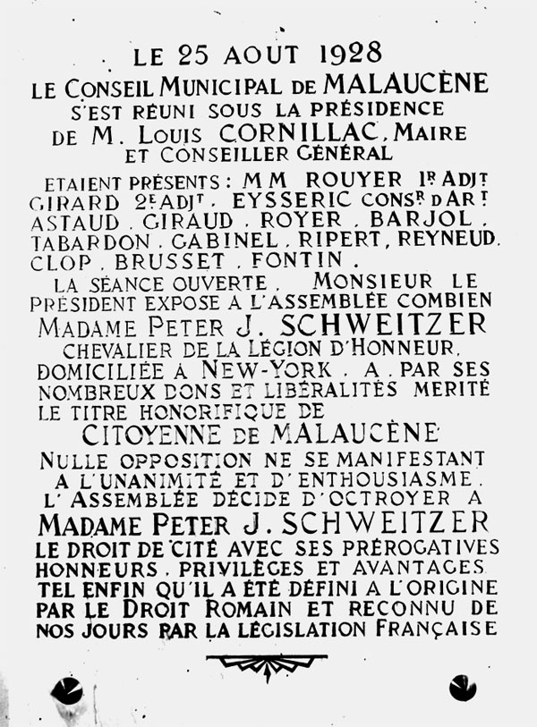 C'est à cette époque que l'on commence à parler de qualité de l'eau du Groseau. La minoterie Cornillac située en aval sur la rivière conduit les Papeteries devant le tribunal. Tout s'arrangera en partie grâce à la diplomatie de Laderrière. En 1928, on signe la paix et la municipalité de Malaucène - à la tête de laquelle se trouve Louis Cornillac - donne à Rebecca le titre de "citoyenne du village". A partir de là, on dit que les Américains, via Rebecca, ont fait preuve d'une grande tendresse pour Malaucène. Et on s'habitue facilement à ce sentiment !