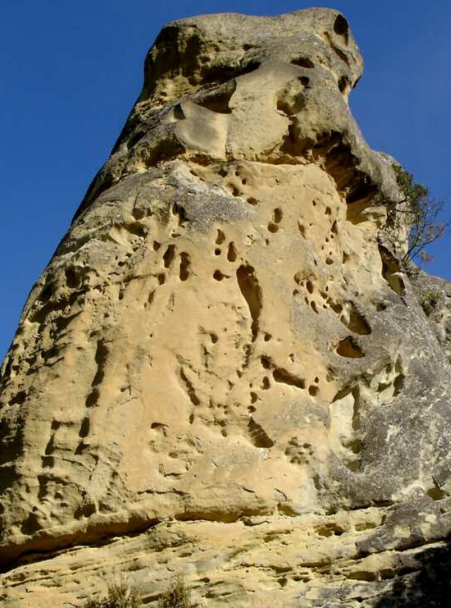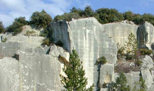 (non stratifié, sans former de bancs). Au pied de la Plate, on aperçoit les carrières romaines. La pointe du Ventoux est du Barrémien qui se délite sous l’effet du gel et du dégel.