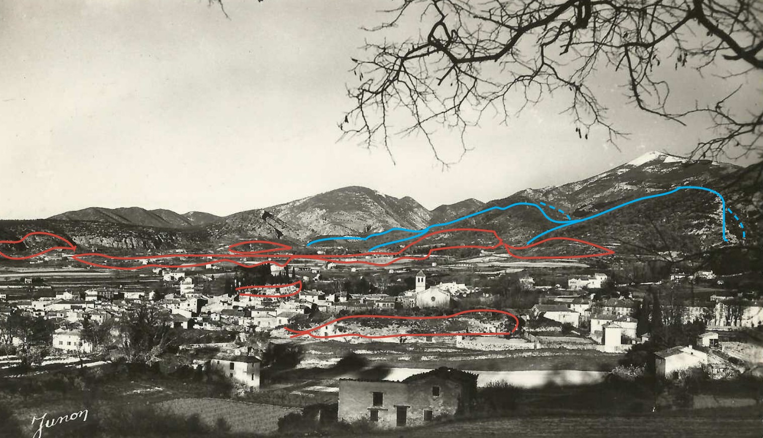 Les traits rouges encadrent les Safres, derniers formés. Les traits bleus marquent les emplacements du Burdigalien qui, à Beaumont, s’est accumulé sur une grande épaisseur, non lité