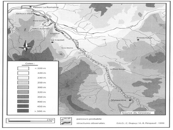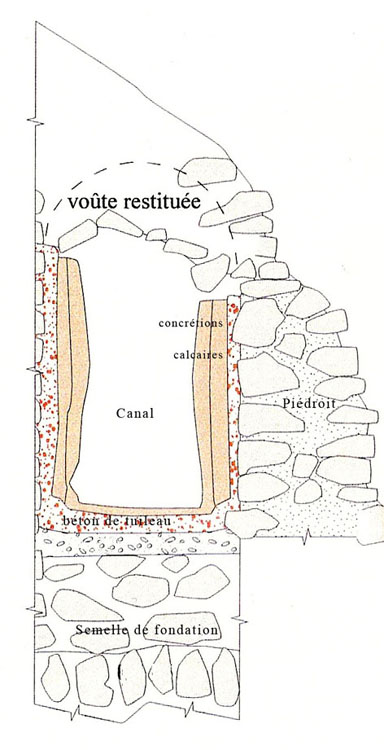 Profil de l'aqueduc. Les Carnets du Ventoux n° 50. C. Dupuy et J-M MignonTracé possible de l'aqueduc. Les Carnets du Ventoux n° 50. C. Dupuy et J-M MignonTracé possible de l'aqueduc. Les Carnets du Ventoux n° 50. C. Dupuy et J-M MignonTracé possible