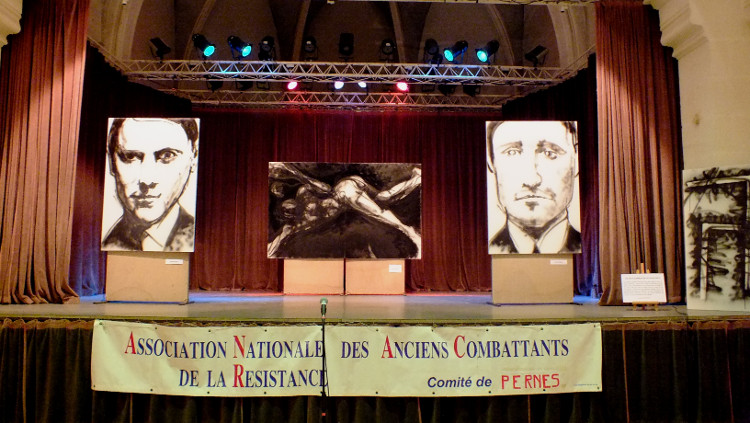 L'Occupation autour de Carpentras 4 Difficile de faire de longs discours quand tu entres dans l’immense salle des Augustins et que tu prends les tableaux noir et blanc (souvent noir sur noir) de Luc Ta Van Thinh (centrés sur Jean Moulin, mais pas seulement) en pleine figure ! Soyons brefs donc.