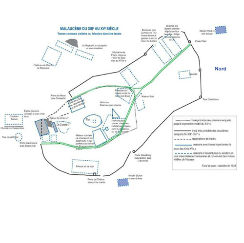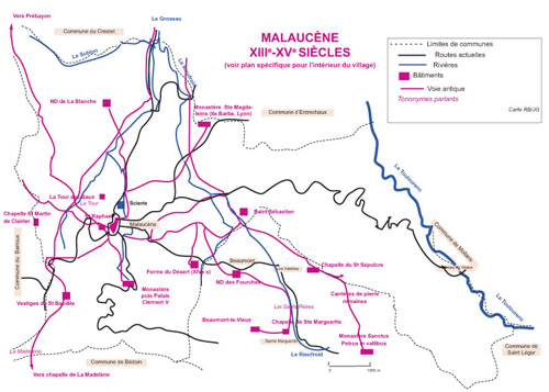 Un plan de Malaucène au Moyen Âge En recoupant toutes les informations, il a été possible de dresser ce plan de la commune au Moyen Âge. Plan réalisé par J. Galas et R. Blanc. ... + d'infos |